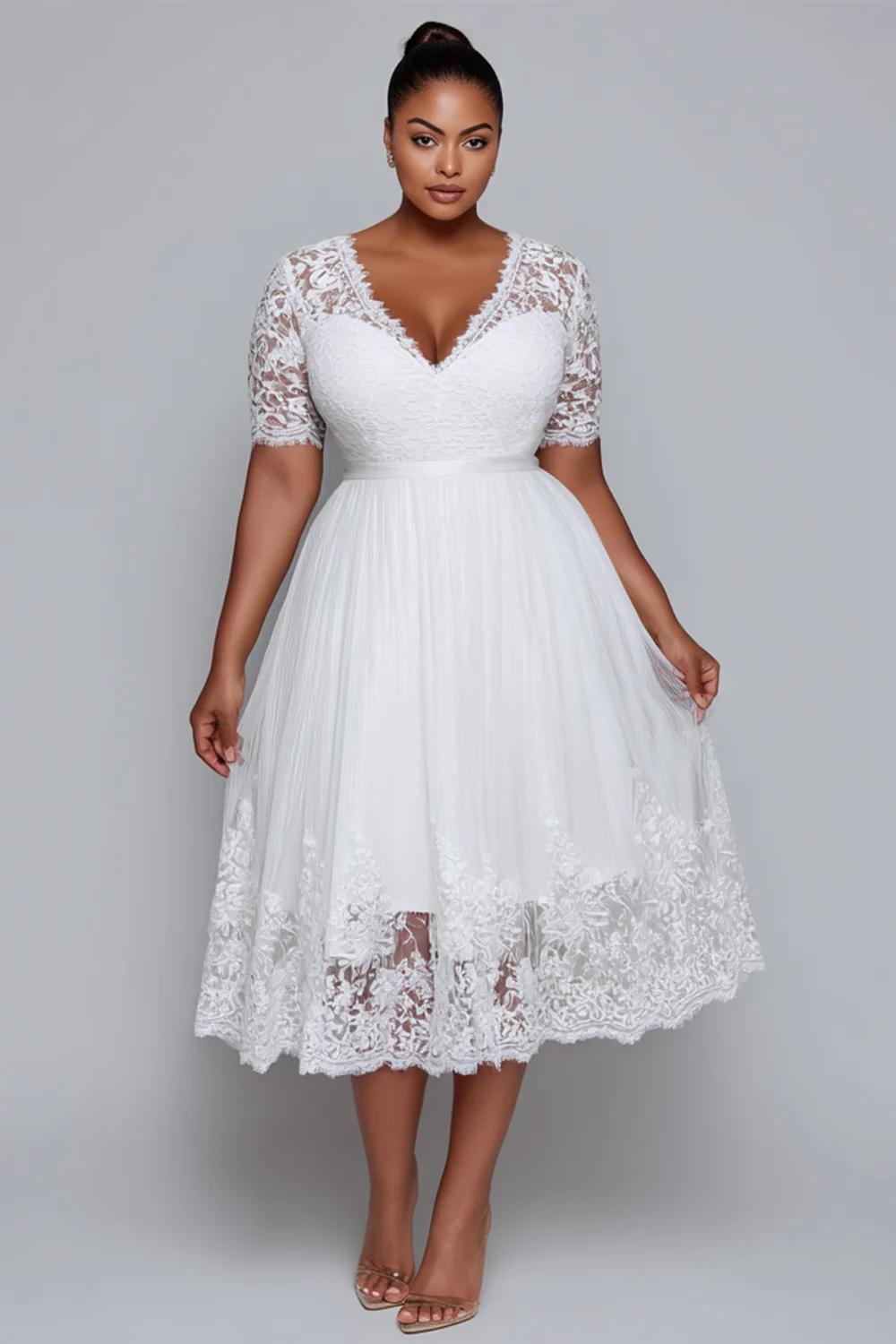 Xpluswear Design Plus Size Wedding White V Neck Short Sleeve Contrast See Through Tulle Midi Dresses [Pre-Order] 2024 - Xpluswear